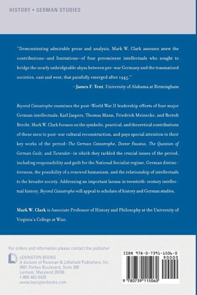 Beyond Catastrophe examines the post-World War II leadership efforts of four major German intellectuals: Karl Jaspers, Thomas Mann, Friedrich Meinecke, and Bertolt Brecht. Clark focuses on the symbolic, practical, and theoretical contributions of these men to post-war cultural reconstruction, and pays special attention to their key works of the period.