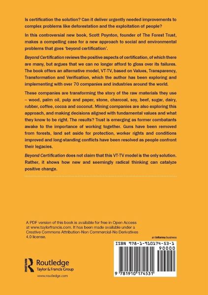 This book is free to download in PDF and EPub formats. Is certification the solution? Can it deliver urgently needed improvements to complex problems like deforestation and the exploitation of people? In this controversial new book, Scott Poynton, founder of The Forest Trust, makes a compelling case for a new approach to social and environmental problems that goes "beyond certification".Certification emerged from the 1992 Rio Earth Summit amidst great hope. Since then, despite a proliferation of certification schemes in twenty-five industry sectors, the destructive and irresponsible exploitation of natural and human resources has grown still worse. Beyond Certification reviews the positive aspects of certification, of which there are many, but argues that we can no longer afford to gloss over its failures. The book offers an alternative model, VT-TV, based on Values, Transparency, Transformation and Verification, which the author has been exploring and implementing with over 70 companies and industries around the world. These companies are transforming the story of the raw materials they use - wood, palm oil, pulp and paper, stone, charcoal, soy, beef, sugar, dairy, rubber, coffee, cocoa and coconut. Mining companies are also exploring this approach, making decisions aligned with fundamental values and what they know to be right.The results? Trust is emerging as former combatants awake to the importance of working together. Guns have been removed from forests, land set aside for protection, worker rights and conditions improved and long-standing conflicts have been resolved as people confront their legacies. Beyond Certification does not claim that this VT-TV model is the only solution. Rather, it shows how new and seemingly radical thinking can catalyze positive change. Included: the limits of roundtable certification illustrated with real, practical examples; the intricacies of the change process - how companies move from destructive to more responsible practices; how to implement more holistic, economically effective, durable systems to better protect people and the environment.