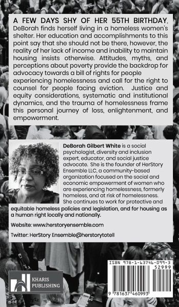 A few days shy of her 55th birthday, DeBorah finds herself living in a homeless women's shelter. Her education and accomplishments to this point say that she should not be there, however, the reality of her lack of income and inability to maintain housing insists otherwise. Attitudes, myths, and perceptions about poverty provide the backdrop for advocacy towards a bill of rights for people experiencing homelessness and call for the right to counsel for people facing eviction. Justice and equity considerations, systematic and institutional dynamics, and the trauma of homelessness frame this personal journey of loss, enlightenment, and empowerment.