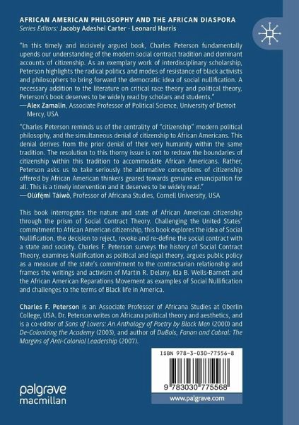 This book interrogates the nature and state of African American citizenship through the prism of Social Contract Theory. Challenging the United States' commitment to African American citizenship, this book explores the idea of Social Nullification, the decision to reject, revoke and re-define the social contract with a state and society. Charles F. Peterson surveys the history of Social Contract Theory, examines Nullification as political and legal theory, argues public policy as a measure of the state's commitment to the contractarian relationship and frames the writings and activism of Martin R. Delany, Ida B. Wells-Barnett and the African American Reparations Movement as examples of Social Nullification and challenges to the terms of Black life in America.