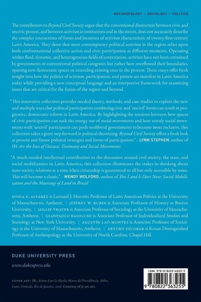 The contributors to Beyond Civil Society argue that the conventional distinction between civic and uncivic protest, and between activism in institutions and in the streets, does not accurately describe the complex interactions of forms and locations of activism characteristic of twenty-first-century Latin America. They show that most contemporary political activism in the region relies upon both confrontational collective action and civic participation at different moments. Operating within fluid, dynamic, and heterogeneous fields of contestation, activists have not been contained by governments or conventional political categories, but rather have overflowed their boundaries, opening new democratic spaces or extending existing ones in the process. These essays offer fresh insight into how the politics of activism, participation, and protest are manifest in Latin America today while providing a new conceptual language and an interpretive framework for examining issues that are critical for the future of the region and beyond. Contributors. Sonia E. Alvarez, Kiran Asher, Leonardo Avritzer, Gianpaolo Baiocchi, Andrea Cornwall, Graciela DiMarco, Arturo Escobar, Raphael Hoetmer, Benjamin Junge, Luis E. Lander, Agustín Laó-Montes, Margarita López Maya, José Antonio Lucero, Graciela Monteagudo, Amalia Pallares, Jeffrey W. Rubin, Ana Claudia Teixeira, Millie Thayer