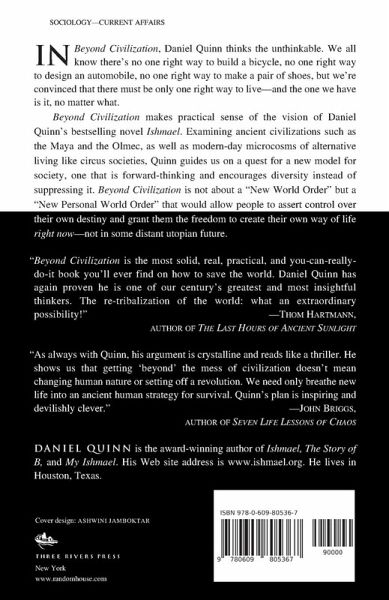 In Beyond Civilization, Daniel Quinn thinks the unthinkable. We all know there's no one right way to build a bicycle, no one right way to design an automobile, no one right way to make a pair of shoes, but we're convinced that there must be only one right way to live -- and the one we have is it, no matter what. Beyond Civilization makes practical sense of the vision of Daniel Quinn's best-selling novel Ishmael. Examining ancient civilizations such as the Maya and the Olmec, as well as modern-day microcosms of alternative living like circus societies, Quinn guides us on a quest for a new model for society, one that is forward-thinking and encourages diversity instead of suppressing it. Beyond Civilization is not about a "New World Order" but a "New Personal World Order" that would allow people to assert control over their own destiny and grant them the freedom to create their own way of life right now -- not in some distant utopian future.