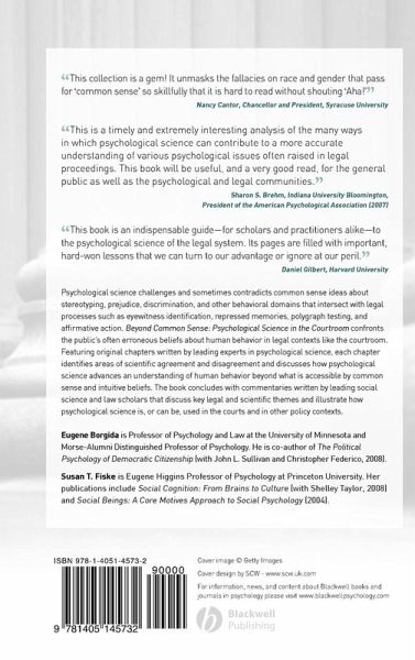Psychological science challenges and sometimes contradicts common sense ideas about stereotyping, prejudice, discrimination, and other behavioral domains that intersect with legal processes such as eyewitness identification, repressed memories, polygraph testing, and affirmative action. Beyond Common Sense confronts the public's often erroneous beliefs about human behavior in legal contexts like the courtroom. Featuring original chapters written by leading experts in psychological science, each chapter identifies areas of scientific agreement and disagreement and discusses how psychological science advances an understanding of human behavior beyond what is accessible by common sense and intuitive beliefs. The book concludes with commentaries written by leading social science and law scholars that discuss key legal and scientific themes and illustrate how psychological science is, or can be, used in the courts and in other policy contexts.