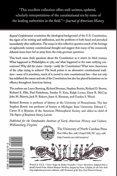 Beyond Confederation scrutinizes the ideological background of the U.S. Constitution, the rigors of its writing and ratification, and the problems it both faced and provoked immediately after ratification. The essays in this collection question much of the heritage of eighteenth-century constitutional thought and suggest that many of the commonly debated issues have led us away from the truly germane questions. The authors challenge many of the traditional generalizations and the terms and scope of that debate as well. The contributors raise fresh questions about the Constitution as it enters its third century. What happened in Philadelphia in 1787, and what happened in the state ratifying conventions? Why did the states--barely--ratify the Constitution? What were Americans of the 1789s attempting to achieve? The exploratory conclusions point strongly to an alternative constitutional tradition, some of it unwritten, much of it rooted in state constitutional law; a tradition that not only has redefined the nature and role of the Constitution but also has placed limitations on its efficacy throughout American history. The authors are Lance Banning, Richard Beeman, Stephen Botein, Richard D. Brown, Richard E. Ellis, Paul Finkelman, Stanley N. Katz, Ralph Lerner, Drew R. McCoy, John M. Murrin, Jack N. Rakove, Janet A. Riesman, and Gordon S. Wood.