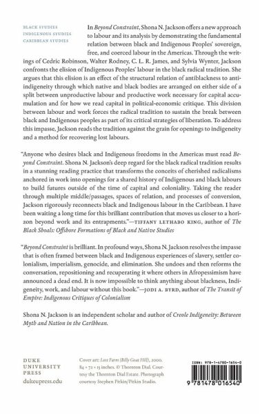 In Beyond Constraint, Shona N. Jackson offers a new approach to labour and its analysis by demonstrating the fundamental relation between black and Indigenous People's sovereign, free, and coerced labour in the Americas. Through the writings of Cedric Robinson, Walter Rodney, C. L. R. James, and Sylvia Wynter, Jackson confronts the elision of Indigenous People's labour in the black radical tradition. She argues that this elision is an effect of the structural relation of antiblackness to anti-indigeneity through which native and black bodies are arranged on either side of a split between unproductive labour and productive work necessary for capital accumulation and for how we read capital in political economic critique. This division between labour and work forces the radical tradition to sustain the break between black and Indigenous peoples as part of its critical strategies of liberation. To address this impasse, Jackson reads the tradition against the grain for openings to indigeneity and a method for recovering lost labours.
