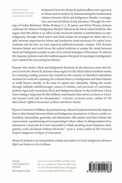 In Beyond Constraint, Shona N. Jackson offers a new approach to labour and its analysis by demonstrating the fundamental relation between black and Indigenous People's sovereign, free, and coerced labour in the Americas. Through the writings of Cedric Robinson, Walter Rodney, C. L. R. James, and Sylvia Wynter, Jackson confronts the elision of Indigenous People's labour in the black radical tradition. She argues that this elision is an effect of the structural relation of antiblackness to anti-indigeneity through which native and black bodies are arranged on either side of a split between unproductive labour and productive work necessary for capital accumulation and for how we read capital in political economic critique. This division between labour and work forces the radical tradition to sustain the break between black and Indigenous peoples as part of its critical strategies of liberation. To address this impasse, Jackson reads the tradition against the grain for openings to indigeneity and a method for recovering lost labours.