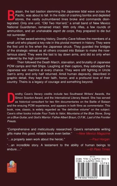 Bataan, the last bastion stemming the Japanese tidal wave across the Pacific, was about to fall. In the midst of crashing bombs and depleted stores, the vastly outnumbered lines broke and commands disintegrated. Only one unit, 'Old Two Hon'erd," a small band of New Mexico National Guardsmen, remained intact. With only rifles, a few rounds of ammunition, and an unshakable esprit de corps, they prepared to die but not surrender. In her award-winning history, Dorothy Cave follows the members of a small unit who played a key role in this pivotal moment in history. They were the first unit to fire when the Japanese struck. They guarded the bridges of the strategic retreat as all others crossed into Bataan to make the now-famous stand. They were the last to lay down arms, and did so only when ordered by the high command. Then followed the Death March, starvation, and brutality of Japanese POW camps and Hell Ships. Laughing at their captors, they sabotaged the Japanese war machine at every chance. They were still fighting in Uncle Sam's army and only half returned. Amid human depravity, described in graphic detail, they kept their faith, honor, and a profound love of their country. Theirs is a legacy of courage and something beyond. Dorothy Cave's literary credits include two Southwest Writers' Awards, the Simon Scanlon Award, and the International Literary Award. She has served as historical consultant for two film documentaries on the Battle of Bataan and the ensuing POW experience, and appears in both films as commentator. This book, now, classic, is widely regarded as "the definitive volume" on the subject. Cave's other books, all from Sunstone Press, include "Four Trails to Valor," "Mountains of the Blue Stone," "Song on a Blue Guitar," and "God's Warrior: Father Albert Braun, O.F.M., Last of the Frontier Priests."