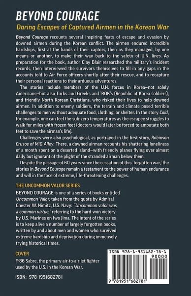 Beyond Courage recounts several inspiring feats of escape and evasion by downed airmen during the Korean conflict. The airmen endured incredible hardships, first at the hands of their captors, then as they managed, by one means or another, to make their way back to the safety of U.N. lines. As preparation for the book, author Clay Blair researched the military's incident records, then interviewed the survivors themselves to fill in any gaps in the accounts told to Air Force officers shortly after their rescue, and to recapture their personal reactions to their arduous adventures. The stories include members of the U.N. forces in Korea-not solely Americans-but also Turks and Greeks and 'ROK's (Republic of Korea soldiers), and friendly North Korean Christians, who risked their lives to help downed airmen. In addition to enemy soldiers, the terrain and climate posed terrible challenges to men without adequate food, clothing, or shelter. In the story Cold, for example, one can feel the sub-zero temperatures as the escapee struggles to walk for miles with frozen feet (doctors would later be forced to amputate both feet to save the airman's life). Challenges were also psychological, as portrayed in the first story, Robinson Crusoe of MiG Alley. There, a downed airman recounts his shattering loneliness of a month spent on a deserted island-with friendly planes flying over almost daily but ignorant of the plight of the stranded airman below them. Despite the passage of nearly 70 years since the cessation of this 'forgotten war, ' the stories in Beyond Courage remain a testament to the power of human endurance and will in the face of extreme, life-threatening challenges.