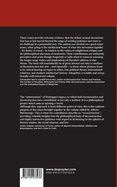 Although they approach it from different points of view, this is the common purpose of the essays brought together in the volume edited by Alberto Martinengo. This is what the contributors describe as 'reconstruction', providing valuable insights into the philosophical basis of deconstruction and highly instructive guidance with regard to its bearing on the spheres of literary studies, the social sciences, and law."