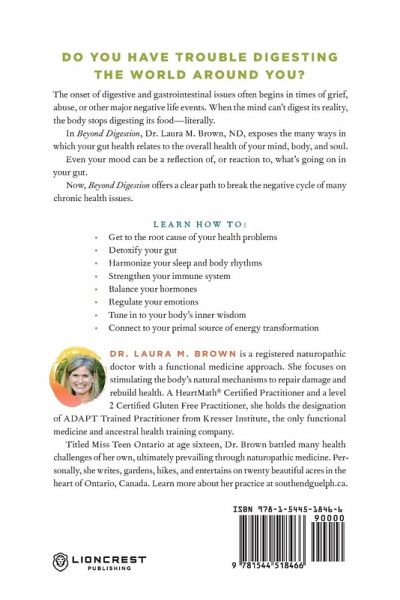 Do you have trouble digesting the world around you? The onset of digestive and gastrointestinal issues often begins in times of grief, abuse, or other major negative life events. When the mind can't digest its reality, the body stops digesting its food-literally. In Beyond Digestion, Dr. Laura M. Brown, ND, exposes the many ways in which your gut health relates to the overall health of your mind, body, and soul. Even your mood can be a reflection of, or reaction to, what's going on in your gut. Now, Beyond Digestion offers a clear path to break the negative cycle of many chronic health issues. Learn how to: * Get to the root cause of your health problems * Detoxify your gut * Harmonize your sleep and body rhythms * Strengthen your immune system * Balance your hormones * Regulate your emotions * Tune in to your body's inner wisdom * Connect to your primal source of energy transformation