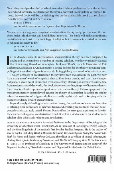 Demonstrates definitively that the secularization thesis is correct, and religion is losing its grip on societies worldwide In the decades since its introduction, secularization theory has been subjected to doubt and criticism from a number of leading scholars, who have variously claimed that it is wrong, flawed, or incomplete. In Beyond Doubt, Isabella Kasselstrand, Phil Zuckerman, and Ryan T. Cragun mount a strong defense for the theory, providing compelling evidence that religion is indeed declining globally as a result of modernization. Though defenses of secularization theory have been mounted in the past, we now have many years' worth of empirical data to illuminate trends, and can trace changes not just at a given point in time but over a trajectory. Drawing on extensive survey data from nations around the world, the book demonstrates that, in spite of its many detractors, there is robust empirical support for secularization theory. It also engages with the most prominent criticisms levied against the theory, showing that data that are said to refute the narrative of religious decline are easily explainable and in keeping with the broader tendency toward secularization. Beyond simply defending secularization theory, the authors endeavor to formalize it, offering clear definitions of relevant terms and creating propositions that can be repeatedly and accurately tested. Beyond Doubt offers the strongest argument to date for the existence of a global secularization trend, and will be a vital resource for students and scholars alike who study religion and secularism.