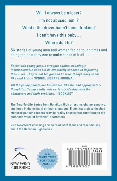 Six short stories about teens in crisis are presented with alternate male and female narrators. Story lines include such young adult concerns as teen pregnancy, abortion, abusive partners, racism, failing at school, a fatal auto accident after a party where alcohol was served, and coping with family obligations to care for an aging relative.