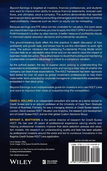 DAVID A. HOLLAND is an independent consultant who serves as a senior advisor to Credit Suisse and is an adjunct professor at the University of Cape Town Graduate School of Business. Formerly, he was a managing director at Credit Suisse based in London. David oversaw HOLT Valuation and Analytics, the research and development arm of Credit Suisse HOLT, and ran their global Custom Solutions Group. BRYANT A. MATTHEWS is the senior director of research for Credit Suisse HOLT. He has over 20 years of professional experience valuing stocks and helping professional investors improve their stock selection process and valuation models. His research on understanding quality and fade has been adopted by professional investors around the world and led to numerous innovations in the flagship Credit Suisse HOLT Lens application.
