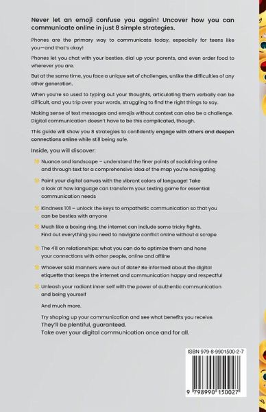 Never let an emoji confuse you again! Uncover how you can communicate online in just 8 simple strategies. Technology is more than the future-it's the present, too. So much communication today takes place online and through cell phones. Especially with teens like you, phones are the primary way to communicate-and that's okay! Phones let you chat with your besties, dial up your parents, and even order food to wherever you are. What's not to love? But at the same time, you face a unique set of challenges, unlike the difficulties of any other generation. When you're so used to typing out your thoughts, articulating them verbally can be difficult, and you trip over your words, struggling to find the right things to say. Making sense of text messages and emojis without context can also be a challenge. Think about it-how many meanings can one simple emoji have? How do you know if someone's joking or being serious? How many times do you wonder what someone's really feeling and trying to say behind the screen? Digital communication doesn't have to be this complicated, though. Imagine walking through the other end of the maze, confidently engaging with others and deepening connections online while still being safe. That's how it should be, and the tool to get you there is right in front of you. In this guide to effective communication for teens, just a fraction of the skills you will discover include: ¿ Nuance and landscape - understand the finer points of socializing online and through text for a comprehensive idea of the map you're navigating ¿ Paint your digital canvas with the vibrant colors of language! Take a look at how language can transform your texting game for essential communication needs ¿ Kindness 101 - unlock the keys to empathetic communication so that you can be besties with anyone ¿ Much like a boxing ring, the internet can include some tricky fights. Find out everything you need to navigate conflict online without a scrape ¿ The 411 on relationships: what you can do to optimize them and hone your connections with other people, online and offline ¿ Whoever said manners were out of date? Be informed about the digital etiquette that keeps the internet and communication happy and respectful ¿ Unleash your radiant inner self with the power of authentic communication and being yourself And much more. You might think that there's nothing wrong with the way you communicate, that your point gets across just fine. But give it a chance-try shaping up your communication and see what benefits you receive. They'll be plentiful, guaranteed. So, are you ready to get out of that maze unscathed, or do you want to continue running in circles until the end of time? Take over your digital communication once and for all: Scroll up and click the "Add to Cart" button right now.
