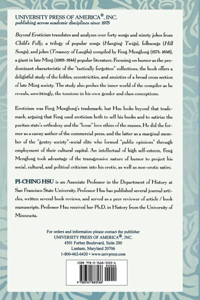 Beyond Eroticism translates and analyzes over forty songs and ninety jokes from Child's Folly, a trilogy of popular songs (Hanging Twigs), folk songs (Hill Songs), and jokes (Treasury of Laughs) compiled by Feng Menglong (1574-1646), and giant in late Ming popular literature (1368-1644). Focusing on humor as the predominant characteristic of the "tactically forgotten" collections, the book offers a delightful study of the foibles, eccentricities, and anxieties of a broad cross section of late Ming society.