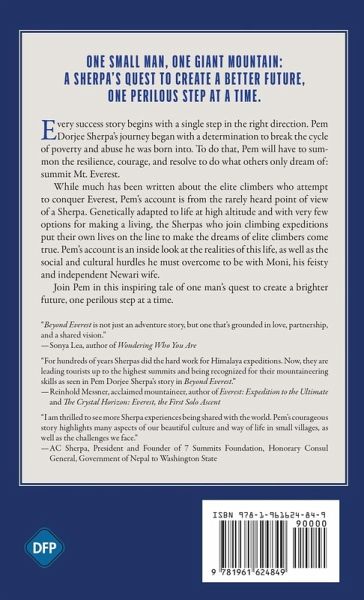One small man, one giant mountain: a Sherpa's quest to create a better future, one perilous step at a time. Every success story begins with a single step in the right direction. Pem Dorjee Sherpa's journey began with a determination to break the cycle of poverty and abuse he was born into. To do that, Pem will have to summon the resilience, courage, and resolve to do what others only dream of: summit Mt. Everest. While much has been written about the elite climbers who attempt to conquer Everest, Pem's account is from the rarely heard point of view of a Sherpa. Genetically adapted to life at high altitude and with very few options for making a living, the Sherpas who join climbing expeditions put their own lives on the line to make the dreams of elite climbers come true. Pem's account is an inside look at the realities of this life, as well as the social and cultural hurdles he must overcome to be with Moni, his feisty and independent Newari wife. Join Pem in this inspiring tale of one man's quest to create a brighter future, one perilous step at a time.