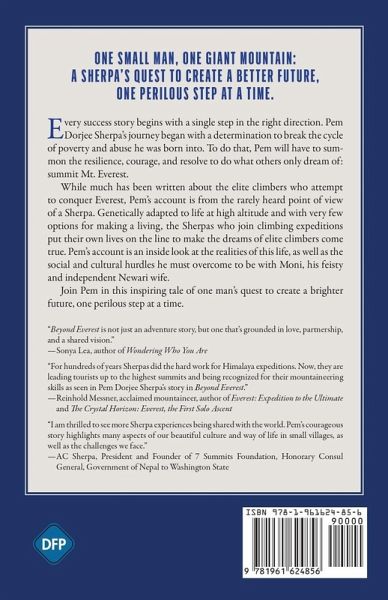 One small man, one giant mountain: a Sherpa's quest to create a better future, one perilous step at a time. Every success story begins with a single step in the right direction. Pem Dorjee Sherpa's journey began with a determination to break the cycle of poverty and abuse he was born into. To do that, Pem will have to summon the resilience, courage, and resolve to do what others only dream of: summit Mt. Everest. While much has been written about the elite climbers who attempt to conquer Everest, Pem's account is from the rarely heard point of view of a Sherpa. Genetically adapted to life at high altitude and with very few options for making a living, the Sherpas who join climbing expeditions put their own lives on the line to make the dreams of elite climbers come true. Pem's account is an inside look at the realities of this life, as well as the social and cultural hurdles he must overcome to be with Moni, his feisty and independent Newari wife. Join Pem in this inspiring tale of one man's quest to create a brighter future, one perilous step at a time.