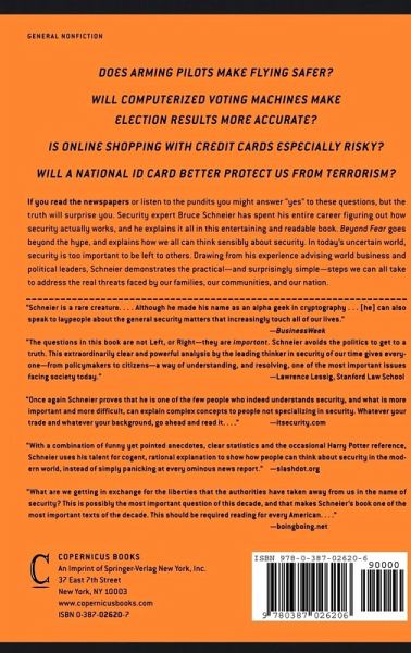"Does arming pilots make flying safer? Computer security guru Schneier applies his analytical skills to real-world threats like terrorists, hijackers, and counterfeiters. BEYOND FEAR may come across as the dry, meticulous prose of a scientist, but that's actually Schneier's strength. Are you at risk or just afraid? Only by cutting away emotional issues to examine the facts, he says, will we reduce our risks enough to stop being scared." -- Wired "Schneier provides an interesting view of the notion of security, outlining a simple five-step process that can be applied to deliver effective and sensible security decisions. These steps are addressed in detail throughout the book, and applied to various scenarios to show how simple, yet effective they can be....Overall, this book is an entertaining read, written in layman's terms, with a diverse range of examples and anecdotes that reinforce the notion of security as a process." --Computing Reviews "Schneier is a rare creature... Although he made his name as an alpha geek in cryptography... [he] can also speak to laypeople about the general security matters that increasingly touch all of our lives." -- Business Week "Once again Schneier proves that he is the one of few people who indeed understands security, and what is more important and more difficult, can explain complex concepts to people not specializing in security. Whatever your trade and whatever your background, go ahead and read it ..." -- itsecurity.com "In his new book, 'Beyond Fear', Bruce Schneier -- one of the world's leading authorities on security trade-offs -- completes the metamorphosis from cryptographer to pragmatist that began with Secrets and Lies, published in 2000." -- infoworld.com