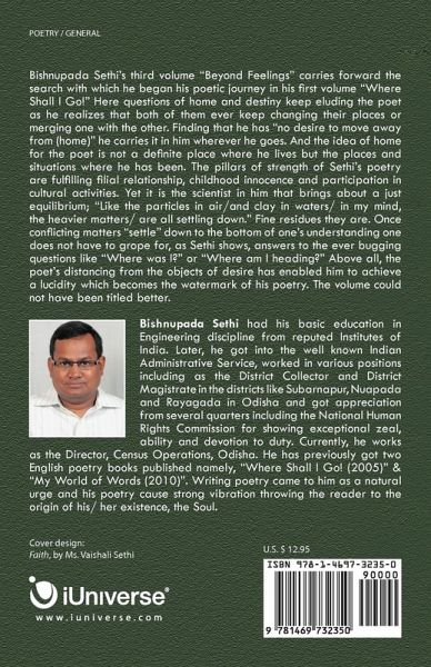 Bishnupada Sethi's third volume "Beyond Feelings" carries forward the search with which he began his poetic journey in his first volume "Where Shall I Go!" Here questions of home and destiny keep eluding the poet as he realizes that both of them ever keep changing their places or merging one with the other. Finding that he has "no desire to move away from (home)" he carries it in him wherever he goes. And the idea of home for the poet is not a definite place where he lives but the places and situations where he has been. The pillars of strength of Sethi's poetry are fulfilling filial relationship, childhood innocence and participation in cultural activities. Yet it is the scientist in him that brings about a just equilibrium; "Like the particles in air/and clay in waters/ in my mind, the heavier matters/ are all settling down." Fine residues they are. Once conflicting matters "settle" down to the bottom of one's understanding one does not have to grope for, as Sethi shows, answers to the ever bugging questions like "Where was I?" or "Where am I heading?" Above all, the poet's distancing from the objects of desire has enabled him to achieve a lucidity which becomes the watermark of his poetry. The volume could not have been titled better.