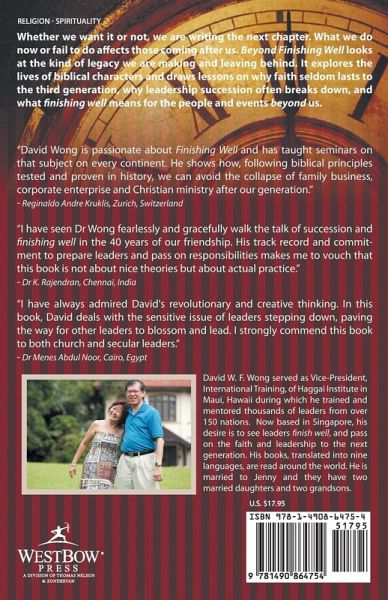 Whether we want to or not, we are writing the next chapter. What we do now-or fail to do-affects those coming after us. Beyond Finishing Well looks at the kind of legacy we will leave behind. It explores the lives of biblical characters and draws lessons on why faith seldom lasts to the third generation, why leadership succession often breaks down, and what finishing well means to the people and events beyond us.