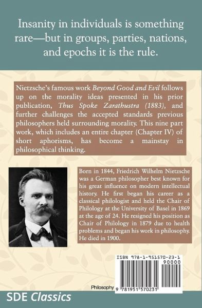 Insanity in individuals is something rare-but in groups, parties, nations, and epochs it is the rule. Nietzsche's famous work Beyond Good and Evil follows up on the morality ideas presented in his prior publication, Thus Spoke Zarathustra (1883), and further challenges the accepted standards previous philosophers held surrounding morality. This nine part work, which includes an entire chapter (Chapter IV) of short aphorisms, has become a mainstay in philosophical thinking.