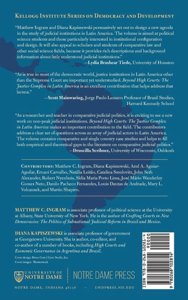 Beyond High Courts: The Justice Complex in Latin America is a much-needed volume that will make a significant contribution to the growing fields of comparative law and politics and Latin American legal institutions. The book moves these research agendas beyond the study of high courts by offering theoretically and conceptually rich empirical analyses of a set of critical supranational, national, and subnational justice sector institutions that are generally neglected in the literature. The chapters examine the region's large federal systems (Argentina, Brazil, and Mexico), courts in Chile and Venezuela, and the main supranational tribunal in the region, the Inter-American Court of Human Rights. Aimed at students of comparative legal institutions while simultaneously offering lessons for practitioners charged with designing such institutions, the volume advances our understanding of the design of justice institutions, how their form and function change over time, what causes those changes, and what consequences they have. The volume also pays close attention to how justice institutions function as a system, exploring institutional interactions across branches and among levels of government (subnational, national, supranational) and analyzing how they help to shape, and are shaped by, politics and law. Incorporating the institutions examined in the volume into the literature on comparative legal institutions deepens our understanding of justice systems and how their component institutions can both bolster and compromise democracy and the rule of law. Contributors: Matthew C. Ingram, Diana Kapiszewski, Azul A. Aguiar-Aguilar, Ernani Carvalho, Natália Leitão, Catalina Smulovitz, John Seth Alexander, Robert Nyenhuis, Sídia Maria Porto Lima, José Mário Wanderley Gomes Neto, Danilo Pacheco Fernandes, Louis Dantas de Andrade, Mary L. Volcansek, and Martin Shapiro.
