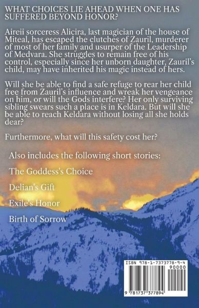 WHAT CHOICES LIE AHEAD WHEN ONE HAS SUFFERED BEYOND HONOR? Aireii sorceress Alicira, last magician of the house of Miteal, has escaped the clutches of Zauril, murderer of most of her family and usurper of the Leadership of Medvara. She struggles to remain free of his control, especially since her unborn daughter, Zauril's child, may have inherited his magic instead of hers. Will she be able to find a safe refuge to rear her child free from Zauril's influence and wreak her vengeance on him, or will the Gods interfere? Her only surviving sibling swears such a place is in Keldara. But will she be able to reach Keldara without losing all she holds dear? Furthermore, what will this safety cost her? Also includes the short stories "The Goddess's Choice," "Delian's Gift," "Exile's Honor," and "Birth of Sorrow."
