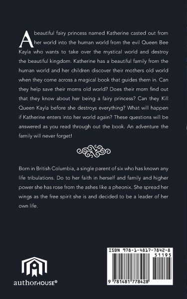 A beautiful fairy princess named Katherine casted out from her world into the human world from the evil Queen Bee Kayla who wants to take over the mystical world and destroy the beautiful kingdom. Katherine has a beautiful family from the human world and her children discover their mothers old world when they come across a magical book that guides them in. Can they help save their moms old world? Does their mom find out that they know about her being a fairy princess? Can they Kill Queen Kayla before she destroys everything? What will happen if Katherine enters into her world again? These questions will be answered as you read through out the book. An adventure the family will never forget!