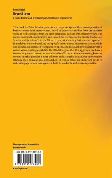 This book by Peter Béndek presents a strong case against the current practice of business operations improvement, based on numerous studies from the business world as well as insights from the most prestigious authors of the last fifty years. The author contests the applicability and indeed the relevance of the Toyota Production System and its spin-offs to the Western context, claiming that a revised approach is much better suited to taking our specific cultural conditions into account, while also combining increased transparency, speed, and sustainability of change with a robust value-creating capability. Dr. Béndek argues that this approach can have a far-reaching impact on corporate cultures by offering an all-encompassing learning system, one that provides a more coherent and actionable continuous improvement strategy than conventional approaches. The book offers an important guide to rethinking operations management, both in academia and businesspractice.