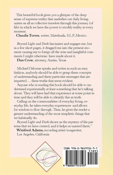 This beautiful book gives you a glimpse of the deep sense of supreme reality that underlies our daily living, unites us all as collective travelers through this journey (of life) in which we have the power to modify reality at every moment. Claudia Torres, writer, Matehuala, S.L.P.,Mexico Beyond Light and Dark fascinates and engages me, but in a few short pages, it dragged me into the present moment causing me to forego all the wise and insightful comments I might otherwise have made about it. Dan Crow, attorney, Austin, Texas Michael Osborne speaks and writes in such an easy fashion, anybody should be able to grasp these concepts of understanding and these particular messages that are imparted.... these truths that seem evident. Anyone who is reading this book should be able to understand experientially at least something that he's talking about. They will have had that experience at some point in time and they will be able to identify this as truth. Calling on the commonalities of everyday living, everyday life, he takes everyday experiences and allows for wisdom to flow through. Thus, he gives the reader a greater understanding of the most simplistic things that we habitually do. Beyond Light and Dark shows us the mystery of the patterns that we have created, and it helps us unravel them." Winifred Adams, recording artist/songwriter, Los Angeles, California