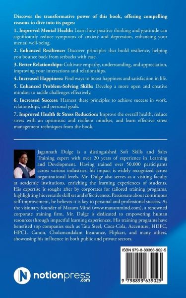 Discover the transformative power of this book, offering compelling reasons to dive into its pages: 1. Improved Mental Health: Learn how positive thinking and gratitude can significantly reduce symptoms of anxiety and depression, enhancing your mental well-being. 2. Enhanced Resilience: Discover principles that build resilience, helping you bounce back from setbacks with ease. 3. Better Relationships: Cultivate empathy, understanding, and appreciation, improving your interactions and relationships. 4. Increased Happiness: Find ways to boost happiness and satisfaction in life. 5. Enhanced Problem-Solving Skills: Develop a more open and creative mindset to tackle challenges effectively. 6. Increased Success: Harness these principles to achieve success in work, relationships, and personal goals. 7. Improved Health & Stress Reduction: Improve the overall health, reduce stress with an optimistic and resilient mindset, and learn effective stress management techniques from the book.