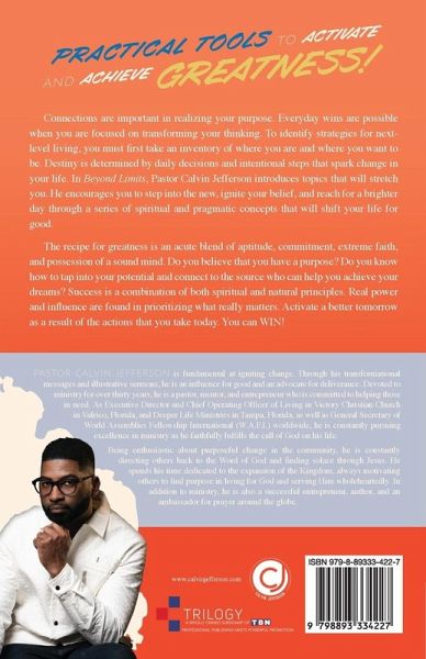 Practical Tools to activate and achieve greatness! Connections are important in realizing your purpose. Everyday wins are possible when you are focused on transforming your thinking. To identify strategies for next-level living, you must first take an inventory of where you are and where you want to be. Destiny is determined by daily decisions and intentional steps that spark change in your life. In Beyond Limits, Pastor Calvin Jefferson introduces topics that will stretch you. He encourages you to step into the new, ignite your belief, and reach for a brighter day through a series of spiritual and pragmatic concepts that will shift your life for good. The recipe for greatness is an acute blend of aptitude, commitment, extreme faith, and possession of a sound mind. Do you believe that you have a purpose? Do you know how to tap into your potential and connect to the source who can help you achieve your dreams? Success is a combination of both spiritual and natural principles. Real power and influence are found in prioritizing what really matters. Activate a better tomorrow as a result of the actions that you take today. You can WIN!