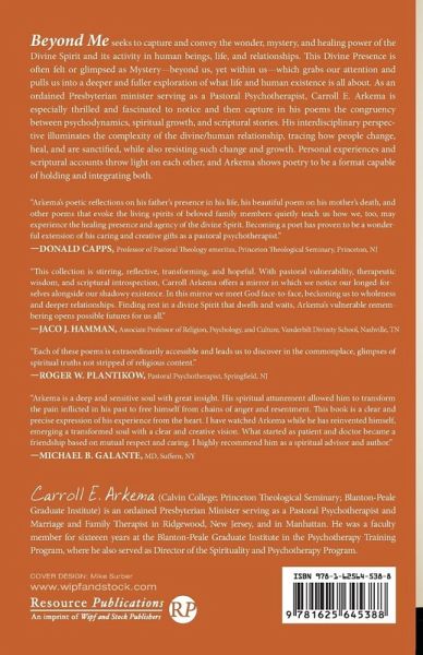 Description: Beyond Me seeks to capture and convey the wonder, mystery, and healing power of the Divine Spirit and its activity in human beings, life, and relationships. This Divine Presence is often felt or glimpsed as Mystery--beyond us, yet within us--which grabs our attention and pulls us into a deeper and fuller exploration of what life and human existence is all about. As an ordained Presbyterian minister serving as a Pastoral Psychotherapist, Carroll E. Arkema is especially thrilled and fascinated to notice and then capture in his poems the congruency between psychodynamics, spiritual growth, and scriptural stories. His interdisciplinary perspective illuminates the complexity of the divine/human relationship, tracing how people change, heal, and are sanctified, while also resisting such change and growth. Personal experiences and scriptural accounts throw light on each other, and Arkema shows poetry to be a format capable of holding and integrating both.