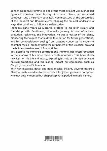 Johann Nepomuk Hummel is one of the most brilliant yet overlooked figures in classical music history. A virtuoso pianist, an acclaimed composer, and a visionary educator, Hummel stood at the crossroads of the Classical and Romantic eras, shaping the musical landscape in ways that continue to influence artists today.From his early years as Mozart's protégé to his later rivalry and friendship with Beethoven, Hummel's journey is one of artistic evolution, resilience, and innovation. He was a master of the piano, pioneering techniques that laid the foundation for future genera-tions, and his compositions-ranging from dazzling concertos to exquisite chamber music - embody both the refinement of the Classical era and the bold expressiveness of Romanticism.Yet, despite his immense contributions, Hummel has often remained in the shadow of his more famous contemporaries. This book sheds new light on his life and legacy, exploring his role as a bridge between musical traditions and his lasting impact on composers such as Chopin, Liszt, and Schumann.With rich historical detail and deep musical insight, Beyond Mozart's Shadow invites readers to rediscover a forgotten genius-a composer who not only witnessed but shaped a pivotal period in music history.