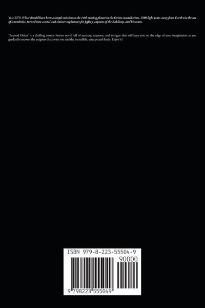 Year 2078. What should have been a simple mission to the 14th mining planet in the Orion constellation, 1300 light years away from Earth via the use of wormholes, turned into a total and sinister nightmare for Jeffrey, captain of the Babilony, and his team. "Beyond Orion" is a thrilling cosmic horror novel full of mystery, suspense, and intrigue that will keep you on the edge of your imagination as you gradually uncover the enigmas that await you and the incredible, unexpected finale. Enjoy it!