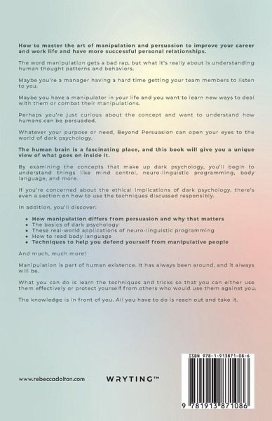 It's hard to find someone who isn't a little bit intrigued about psychology. Whether you have chosen it as your career or you want to learn more about yourself and others in your life, Rebecca Dolton allows us to explore dark psychology, neurolinguistics, addiction, relationships and more in her book series.Thanks to her interest in psychology combined with her pure fascination for how the brain works and reacts to different stimuli, Rebecca Dolton has shown hundreds of people how to live better lives. She gently guides the reader with methods to improve their careers, develop stronger relationships, and deal with addictions and trauma.Her books include Quit drinking and Beyond Persuasion with many others to follow on subjects such as overcoming trauma, anger management and rebuilding your life after personal tragedies. Rebecca hopes that these will help change the lives of many.Reading Rebecca's books doesn't make you feel like someone is intruding. On the contrary, readers can feel safe exploring their thoughts and emotions. There is just the right amount of science to explain the concepts related to the mind but using a language that we can all relate to.You feel safe.