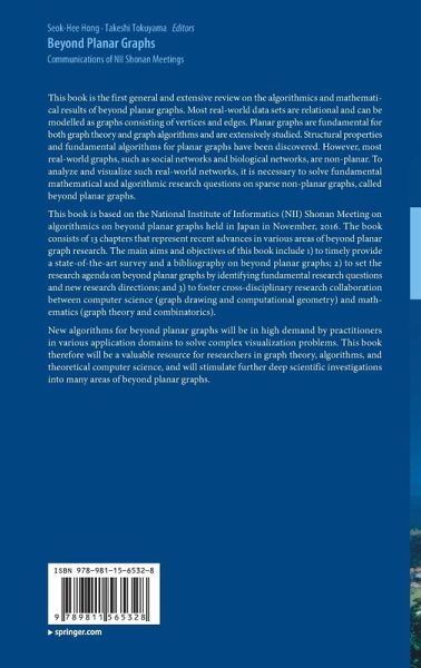 This book is the first general and extensive review on the algorithmics and mathematical results of beyond planar graphs. Most real-world data sets are relational and can be modelled as graphs consisting of vertices and edges. Planar graphs are fundamental for both graph theory and graph algorithms and are extensively studied. Structural properties and fundamental algorithms for planar graphs have been discovered. However, most real-world graphs, such as social networks and biological networks, are non-planar. To analyze and visualize such real-world networks, it is necessary to solve fundamental mathematical and algorithmic research questions on sparse non-planar graphs, called beyond planar graphs.This book is based on the National Institute of Informatics (NII) Shonan Meeting on algorithmics on beyond planar graphs held in Japan in November, 2016. The book consists of 13 chapters that represent recent advances in various areas of beyond planar graph research. The main aims andobjectives of this book include 1) to timely provide a state-of-the-art survey and a bibliography on beyond planar graphs; 2) to set the research agenda on beyond planar graphs by identifying fundamental research questions and new research directions; and 3) to foster cross-disciplinary research collaboration between computer science (graph drawing and computational geometry) and mathematics (graph theory and combinatorics).