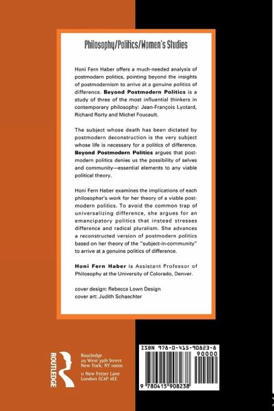 In this book, Honi Haber offers a much-needed analysis of postmodern politics. While continuing to work towards the voicing of the "other," she argues that we must go beyond the insights of postmodernism to arrive at a viable political theory. Postmodernism's political agenda allows the marginalized other to have a voice and to constitute a politics of difference based upon heterogeneity. But Haber argues that postmodern politics denies us the possibility of selves and community--essential elements to any viable political theory.