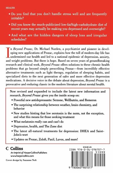 Do you find that you don't handle stress well and are frequently irritable? Did you know the much-publicized low-fat/high-carbohydrate diet of recent years may actually be making you depressed and overweight? And what are the hidden dangers of sleep loss and irregular schedules? In Beyond Prozac, Dr. Michael Norden, a psychiatrist and pioneer in developing new applications of Prozac, explains how the toll of modern-day life has undermined our health and led to a national epidemic of depression, anxiety and weight problems. But there is hope. Based on seven years of groundbreaking research and clinical work, Beyond Prozac offers solutions to these chronic health problems that go beyond simply prescribing Prozac from incredibly effective alternative treatments such as light therapy, regulation of sleeping habits, and specialized diets to the next generation of safer and more effective depression medications. A decisive voice in the debate about depression, Beyond Prozac is a provocative and enduring classic in the modern literature about mental health. Now revised and expanded to include the latest new information and research, Beyond Prozac gives you the inside scoop on: 1. Powerful new antidepressants: Serzone, Wellbutrin and Remeron 2. The surprising relationship between weather, brain chemistry and behavior 3. New studies hinting that low serotonin is the norm, not the exception, and what this means for those seeking treatment 4. What melatonin really can and can't do 5. Depression, health and "The Zone" diet 6. The latest all-natural treatments for depression: DHEA and St. John's wort 7. Updates on Prozac, Zoloft, Paxil, Luvox and more!