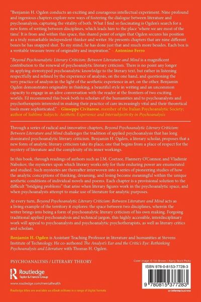 Through a series of radical and innovative chapters, Beyond Psychoanalytic Literary Criticism: Between Literature and Mind challenges the tradition of applied psychoanalysis that has long dominated psychoanalytic literary criticism. Benjamin H. Ogden, a literary scholar, proposes that a new form of analytic literary criticism take its place, one that begins from a place of respect for the mystery of literature and the complexity of its inner workings. In this book, through readings of authors such as J.M. Coetzee, Flannery O'Connor, and Vladimir Nabokov, the mysteries upon which literary works rely for their enduring power are enumerated and studied. Such mysteries are thereafter interwoven into a series of pioneering studies of how the conceptions of thinking, dreaming, and losing become meaningful within the unique aesthetic conditions of individual novels and poems. Each chapter is a provisional solution to the difficult "bridging problems" that arise when literary figures work in the psychoanalytic space, and when psychoanalysts attempt to make use of literature for analytic purposes. At every turn, Beyond Psychoanalytic Literary Criticism: Between Literature and Mind acts as a living example of the territory it explores: the space between two disciplines, wherein the writer brings into being a form of psychoanalytic literary criticism of his own making. Forgoing traditional applied psychoanalysis and technical jargon, this highly accessible, interdisciplinary work will appeal to psychoanalysts and psychoanalytic psychotherapists, as well as literary critics and scholars.