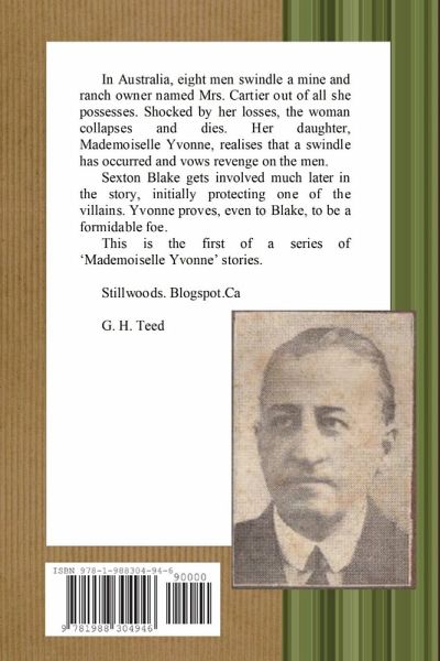 In Australia, eight men swindle a mine and ranch owner named Mrs. Cartier out of all she possesses. Shocked by her losses, the woman collapses and dies. Her daughter, Mademoiselle Yvonne, realises that a swindle has occurred and vows revenge on the men. Sexton Blake gets involved much later in the story, initially protecting one of the villains. Yvonne proves, even to Blake, to be a formidable foe. This is the first of a series of 'Mademoiselle Yvonne' stories.