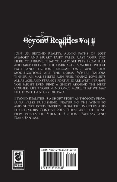 Join us, beyond reality, along paths of lost memory and murky fairy tales. Cast your eyes here, you brave, that you may see pets from hell and minstrels of the dark arts. A world where fact and fiction become one, and body modifications are the norm. Where tailors tinker, animal spirits run free, young love sets all ablaze, and strange fortunes are writ. Perhaps you might even find a ghost around the next corner. Open your mind once more, that we may fill it with a story or two. Beyond Realities is the annual short story anthology from Luna Press Publishing, featuring the winning and shortlisted entries from the Writers and Illustrators Contest 2016. These are the fresh new voices of Science Fiction, Fantasy and Dark Fantasy.