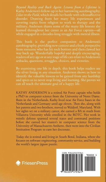 Beyond Reality and Back Again: Lessons from a Lifetime is Kathy Anderson's follow-up to her harrowing autobiography, Lilies in the Field, which details her battle with schizoaffective disorder. Drawing from her many life experiences and covering topics from religion to work to therapy and the military, Anderson shares some of the many life lessons she learned throughout her career as an Air Force captain-all while engaged in a decades-long struggle with mental illness. This book is the perfect companion to Anderson's autobiography, providing new context and a fresh perspective from someone who has hit rock bottom and then clawed her way back up. Wonderfully hopeful and deeply encouraging, readers of any age or at any stage of life can relate to Anderson's setbacks, questions, struggles, choices, and victories. By examining one life in depth, this book helps readers see the silver lining in any situation. Anderson shows us how to identify the valuable lessons to be gained from any hardship and spurs us to never stop living and learning. She proves we can all reach the ultimate goal of a happy life.