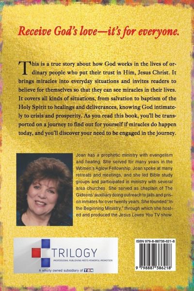 Receive God's love-it's for everyone. This is a true story about how God works in the lives of ordinary people who put their trust in Him, Jesus Christ. It brings miracles into everyday situations and invites readers to believe for themselves so that they can see miracles in their lives. It covers all kinds of situations, from salvation to baptism of the Holy Spirit to healings and deliverances, knowing God intimately to crisis and prosperity. As you read this book, you'll be trans- ported on a journey to find out for yourself if miracles do happen today, and you'll discover your need to be engaged in the journey.