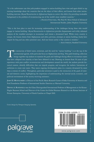 "It is the unfortunate case that policymakers engaged in nation-building have time and again failed to tap existing knowledge about the countries that are the object of their efforts, and lessons from other nation-building exercises. Beyond Reconstruction in Afghanistan begins to correct this deficit by providing invaluable background to the problem of reconstructing one of the world's most troubled countries." - Francis Fukuyama, The Paul H. Nitze School of Advanced International Studies Johns Hopkins University