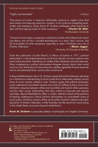 Since the publication of John Rawls's A Theory of Justice in 1971, political philosophers in the English-speaking world have shared a broad consensus that social justice should be understood as a matter of fair distribution of social resources. Many contemporary political philosophers disagree sharply about what would count as a fair distribution of social resources, yet agree that if social resources were to be distributed fairly, then social justice would exist. In Beyond Redistribution, Kevin M. Graham argues that political theories operating on a distributive understanding of social justice fail to address adequately certain forms of social injustice related to race. Graham argues that political philosophy could understand race-related injustice more fully by shifting its focus away from distributive inequities between whites and nonwhites and toward white supremacy, the unfair power relationships that allow whites to dominate and oppress nonwhites. Beyond Redistribution offers a careful, detailed critique of the positions of leading contemporary liberal political philosophers on race-related issues of social justice. Graham's analysis of the racial politics of police violence and public education in Omaha, Nebraska, vividly illustrates why the search for racial justice in the United States must move beyond redistribution.