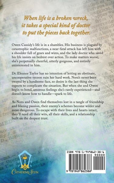 When life is a broken wreck, it takes a special kind of doctor to put the pieces back together. Owen Cassidy's life is in a shambles. His business is plagued by catastrophic malfunctions, a near-fatal attack has left him with a shoulder full of gears and wires, and the lady doctor who saved his life insists on bedrest over action. To make matters worse, she's perpetually cheerful, utterly gorgeous, and entirely uninterested in him. Dr. Eleanor Taylor has no intention of letting an obstinate, uncooperative tycoon ruin her hard work. Nora's never been swayed by a handsome face, so desire is the last thing she expects to complicate the situation. But when she and Owen begin to bond, amorous feelings she's rarely experienced-and doesn't know how to handle-spark to life. As Nora and Owen find themselves lost in a tangle of friendship and blazing passion, their enemy's schemes become wilder and more dangerous. To escape with their lives and hearts intact, they'll need all their wits, all their skills, and a relationship built on the deepest trust.