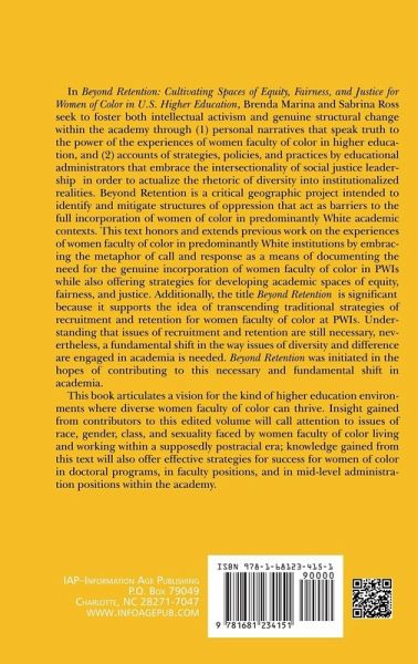 A volume in Research for Social Justice: Personal~Passionate~Participatory Inquiry In Beyond Retention: Cultivating Spaces of Equity, Fairness, and Justice for Women of Color in U.S. Higher Education, Brenda Marina and Sabrina N. Ross address the continued underrepresentation of women faculty of color at predominantly White colleges and universities through a creative convergence of scholarship focused on intellectual activism and structural change. Inspired by the African American oral tradition of call and response, this text illuminates the calls, or personal narratives of women faculty of color who identify racialized, gendered, sexualized, and class-based challenges associated with work in predominantly White institutions. Accounts of social justice-oriented strategies, policies, and practices that support women faculty of color and reflections by women of color who are senior faculty members serve as literal and metaphorical responses. The convergence of calls for social justice and equity-minded responses and reflections in this text provide intellectual foundations for the development of higher education spaces where women faculty of color can thrive. Beyond Retention is a critical geographic project intended to identify and mitigate structures of oppression that act as barriers to the full incorporation of women of color in predominantly White academic contexts. This text will be of interest to scholars interested in curriculum topics of race, gender, sexuality, and place. The text offers strategies for coping and success for women of color in doctoral programs, faculty positions, and mid-level administration positions within the academy; as such, Beyond Retention will be a valuable addition to the reading libraries of each of these groups. Men and women with interests in the experiences of educators of color within predominantly White contexts will also gain valuable insights from this book, as will individuals interested in various areas of women studies, multicultural education, and diversity. Beyond Retention also provides accounts of practices and policies that have been successful in supporting the needs of women faculty of color; knowledge gained from this text will be useful for higher education administrators seeking to improve the campus climate for faculty of color. Additionally, human resource directors, equal opportunity specialists and diversity trainers will find this text helpful when considering strategies for managing diversity.