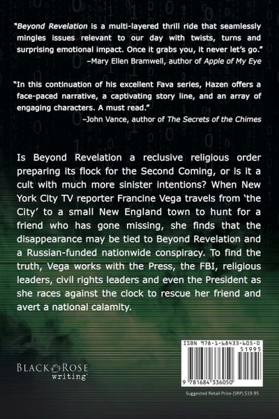 "Hazen cooks up one of his most compelling conspiracies yet in this fast-paced series entry." -BestThrillers.com "Beyond Revelation is a multi-layered thrill ride that seamlessly mingles issues relevant to our day with twists, turns and surprising emotional impact. Once it grabs you, it never let's go." -Mary Ellen Bramwell, author of Apple of My Eye A heavily guarded religious retreat in a bucolic New England town may hold the answer to a rash of unexplained disappearances that have fallen beneath the radar of law enforcement. When NYC reporter Francine Vega learns her friend is missing, her investigation leads her to suspect that her friend, along with other missing African Americans, could be prisoners at Beyond Revelation, a secretive religious encampment. Vega discovers that the cult is involved in a murderous conspiracy to wreak political upheaval in the American government. But how can she prove that the Second Coming that Beyond Revelation is preparing for is actually a bold and deadly plot to destabilize the nation? Vega's race to save her friend and others puts her life, her family and her career in the bullseye of powerful extremists. Even after calling in every favor and ounce of influence possible, can Vega head off the country's End of Days? This heart-stopping political page turner is the third novel in the Vega Investigative Thriller series. Once again, John Hazen weaves the most explosive issues of the day into an intricate, compelling but very human story of bravery and perseverance against all odds. Don't miss a single fast-paced Francine Vega novel! Get your copy of Beyond Revelation today.