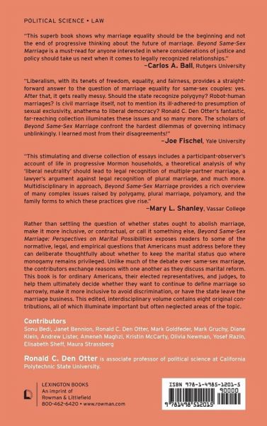 Although the debate over same-sex marriage in the United States has ended, no one seems to know what lies on the horizon. The conversation about what marriage could be like in the future is no longer confined to academics. In his dissent in Obergefell, Chief Justice Roberts linked the constitutionally-mandated legal recognition of same-sex marriage to the possibility that states may also have to recognize multi-person intimate relationships as well to avoid discriminating against plural marriage enthusiasts. The popularity of television shows like TLC's Sister Wives and HBO's Big Love suggests that Americans no longer can be dismissive of the possibility that in the foreseeable future, marriage could, and perhaps should, look very different than it does today. Rather than settling the question of whether states ought to abolish marriage, make it more inclusive, contractual, or call it something else, this book exposes readers to some of the normative, legal, and empirical questions that Americans must address before they can deliberate thoughtfully about whether to keep the marital status quo where monogamy remains privileged. Unlike much of the debate over same-sex marriage, they exchange reasons with one another as they discuss marital reform. This book is for ordinary Americans, their elected representatives, and judges, to help them ultimately decide whether they want to continue to define marriage so narrowly, make it more inclusive to avoid discrimination, or have the state leave the marriage business. This edited, interdisciplinary volume contains eight original contributions, all of which illuminate important but often neglected areas of the topic.
